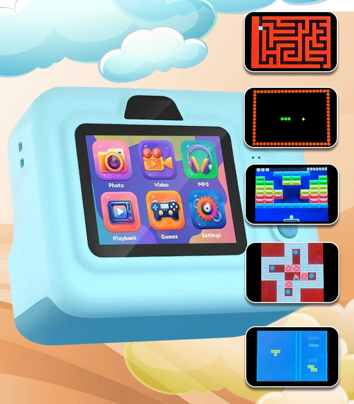 A fényképezőgép ötvözi a fotózást, a 1080P videót és a mini játékokat (rejtvények, kígyó, flipper, szokoban), így szórakoztat és fejleszti a kreativitást. A fényes 2,4" kijelző és az intuitív kezelés megkönnyíti a képek és videók megtekintését és kezelését. A microSD 32 GB-ig memóriakártya-támogatás bőséges helyet biztosít az emlékeknek.