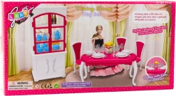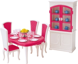 Elegáns bútor- és kiegészítőszett kb. 29 cm-es babákhoz, amely minden babaházat valósághű étkezővé varázsol. Tartalmaz asztalt, székeket, nyitható ajtós kredencet és gazdag terítéket. Tartós műanyag kivitel, rózsaszín–fehér színvilág és klasszikus stílus a kreatív játék, a szociális készségek és a szerepjáték támogatásáért. Megfelel a CE és EN71 szabványoknak.