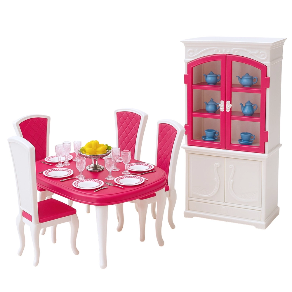 Alkoss a babáknak meghitt helyet közös étkezésekhez és ünnepi lakomákhoz. A szett központja a tágas asztal székekkel, melyet nyitható ajtós kredenc egészít ki az edények tárolásához. A tányérokból, bögrékből, evőeszközökből és dekorációkból álló gazdag felszerelés végtelen jelenet megalkotását teszi lehetővé, fejlesztve a gyerekek fantáziáját.