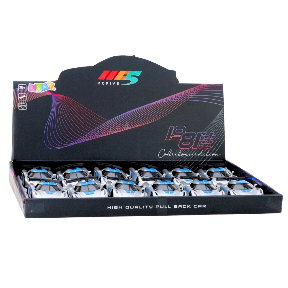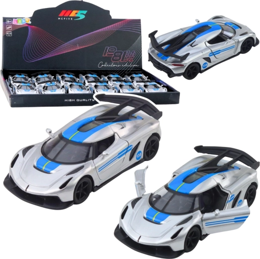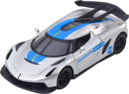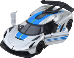 Stílusos fém sportautó 1:32 méretarányban, amely örömet szerez a kis versenyzőknek és a gyűjtőknek egyaránt. Fém karosszériával, nyitható ajtókkal és visszahúzós (pull-back) meghajtással a dinamikus haladásért. Vonzó ezüst dizájn kék elemekkel és részletgazdag kidolgozás a valósághű megjelenésért – sok-sok szórakozás otthon és útközben.