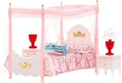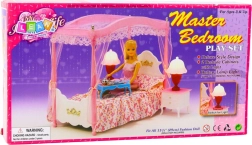 Elegáns hálószobai készlet kb. 29 cm magas babákhoz, amely elbűvöl a baldachinos ággyal, finom függönyökkel és részletgazdag kidolgozással. A csomag része két éjjeliszekrény, lámpácskák és egy teljes ágyneműgarnitúra. A pasztell rózsaszín–fehér kombináció és a minőségi anyag tartósságot és hosszan tartó szórakozást garantál, miközben fejleszti a kreativitást és a fantáziát.