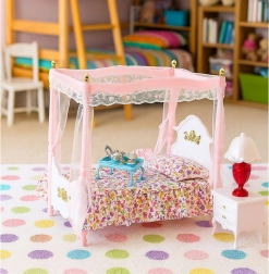 Ezzel a stílusos bútor szettel meghitt, luxus hangulatú hálószobát alakíthatsz ki a babáknak. A középpontban a romantikus baldachinos ágy áll finom függönyökkel, amely mesés atmoszférát kölcsönöz a jelenetnek. A precíz részletek és a harmonikus rózsaszín–fehér színvilág játékra és látványos berendezésekre inspirál.