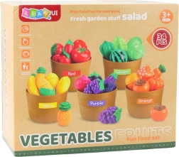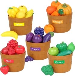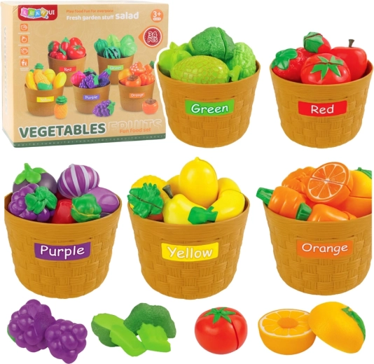 Színes oktatási készlet 34 darabbal, amely megtanítja a gyerekeknek a színek és kategóriák szerinti rendezést, valamint az alapvető konyhai készségeket. A biztonságos műanyagból készült, élethű darabok tépőzárral szeletelhetők, a készlet részeinek szortírozó kosárkák, műanyag kés és vágódeszka. Kiváló választás a finommotorika, a kéz–szem koordináció és a kreatív játék fejlesztéséhez otthon és óvodában.