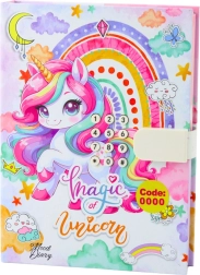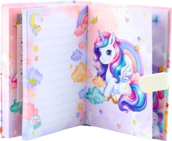 Varázslatos gyermeknapló egyszarvú mintával és számzáras lakattal, amely megőrzi a titkokat és emlékeket. Kinyitás után vidám dallam szólal meg, belül színes, vonalas oldalak és illusztrációk várnak íráshoz és rajzoláshoz. Ideális ajándék, amely szórakozást, magánszférát és kreativitást egyesít.