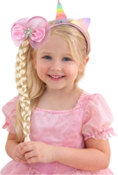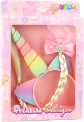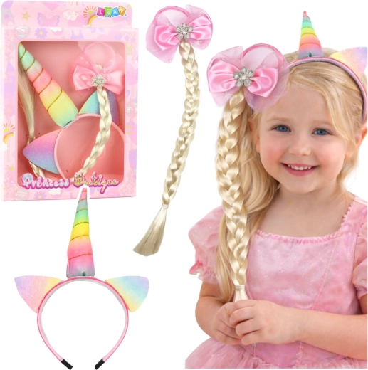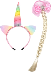 Varázslatos gyerek szett unikornis motívummal, amely egy színes fülekkel és szarvval díszített fejpántot és egy hosszú copffal, rózsaszín masnival ellátott hajgumit egyesít. A univerzális méretnek köszönhetően egész nap kényelmes viselet, és remek választás játékhoz, születésnapokra és jelmezbálokra.