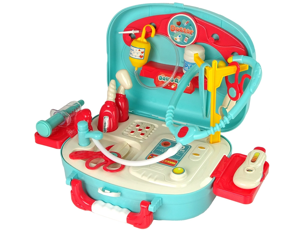 Szórakoztató és fejlesztő gyermek orvosi készlet praktikus, türkiz színű bőröndben, amely támogatja a fantáziát, a tanulást és segít leküzdeni az orvostól való félelmet. Tartalmaz sztetoszkópot, fecskendőt, hőmérőt, ollót és további eszközöket biztonságos, lekerekített formákkal. Ideális ajándék kis orvosoknak 3 éves kortól.