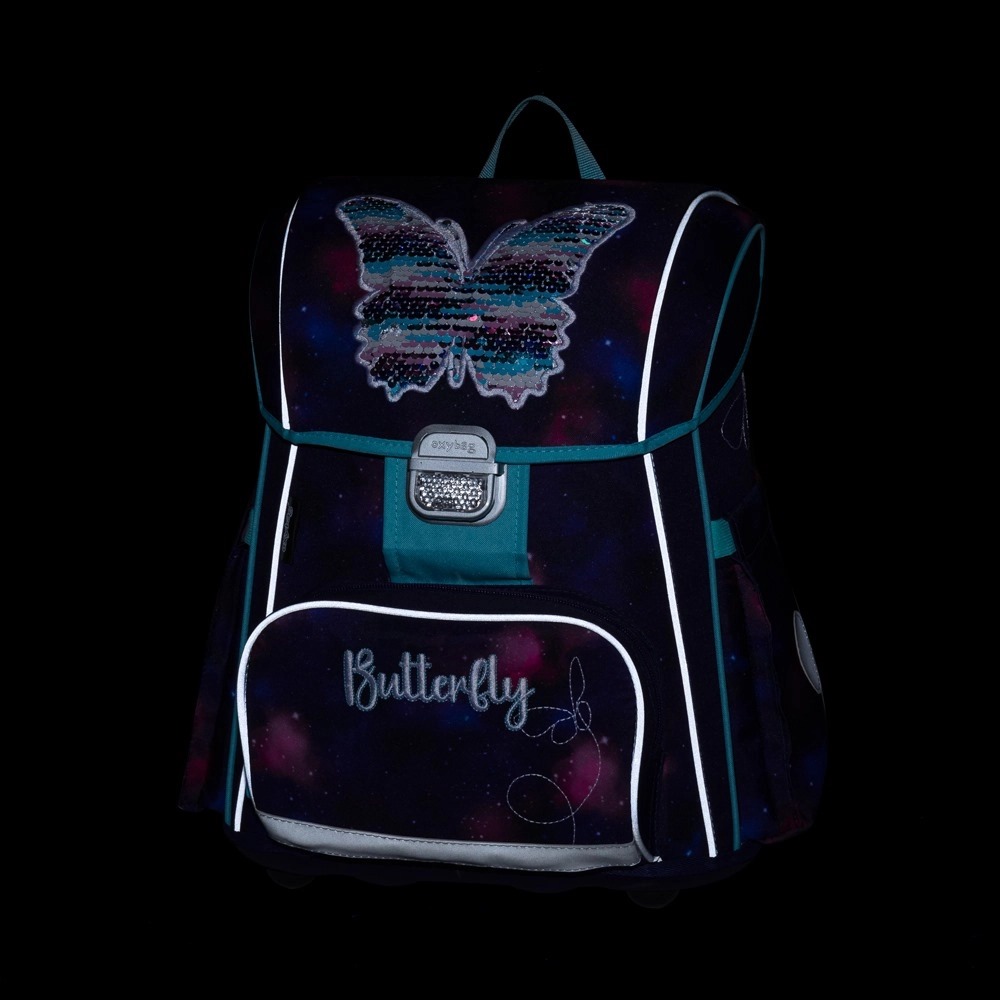 Stílusos iskolai szett 1–2. osztályba, Pillangó motívummal: ergonomikus aktatáska, praktikus tornazsák váltócipőnek és egyszintes tolltartó. Az aktatáska anatómiailag formázott hátpanellel, légáteresztő párnázással és széles, párnázott pántokkal biztosítja a kényelmes hordást. Tágas rekeszt kínál a tanszereknek, stabil aljat a felborulás ellen, valamint biztonsági csatot fényvisszaverő betéttel a jobb láthatóságért.