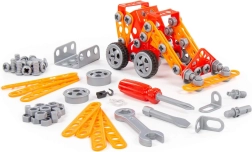 A készlet tartalmaz csavarokat, anyákat, tartókat és gyerekeknek szánt szerszámokat – csavarhúzót és villáskulcsot – az egyszerű összeszereléshez és szétszereléshez.