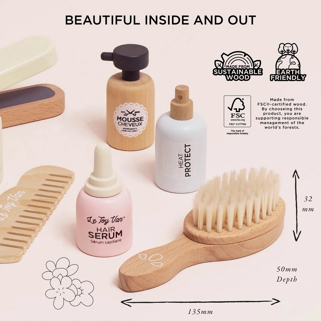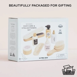 A Le Toy Van gyerek fodrászkészlete órákon át tartó kreatív szórakozást kínál kis stylistoknak. 8 minőségi fa elemet tartalmaz, köztük hajvasalót, kefét, fésűt és kozmetikai kiegészítőket a képzeletbeli hajápoláshoz. FSC-tanúsított fából készült, kézzel van kiegészítő festéssel, nem mérgező, vízbázisú festékekkel, és megfelel a szigorú biztonsági szabványoknak. Fejleszti a képzelőerőt, szociális készségeket és a finommotorikát 3 éves kortól.