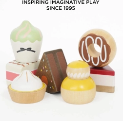 A Le Toy Van háromszintes tortaállványa stílusos és tartós kiegészítő minden gyerekkonyhához vagy játéksarokhoz. Mindegyik szint szépen díszített és átláthatóan elrendezett a kis pékek és vendéglátók számára. A készlet 7 fa édességet tartalmaz, amelyek csábítanak a tálalásra, a megosztásra és a szerepjátékok fejlesztésére.