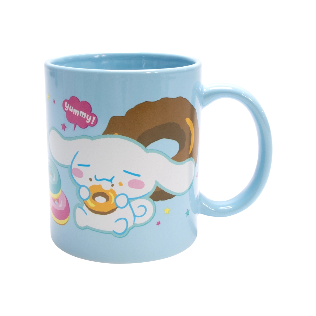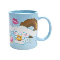 Világoskék kerámia bögre Cinnamoroll és fánkos mintával, ideális reggeli kávéhoz vagy esti teához. Fényes máz és kényelmes fül a kellemes fogáshoz.