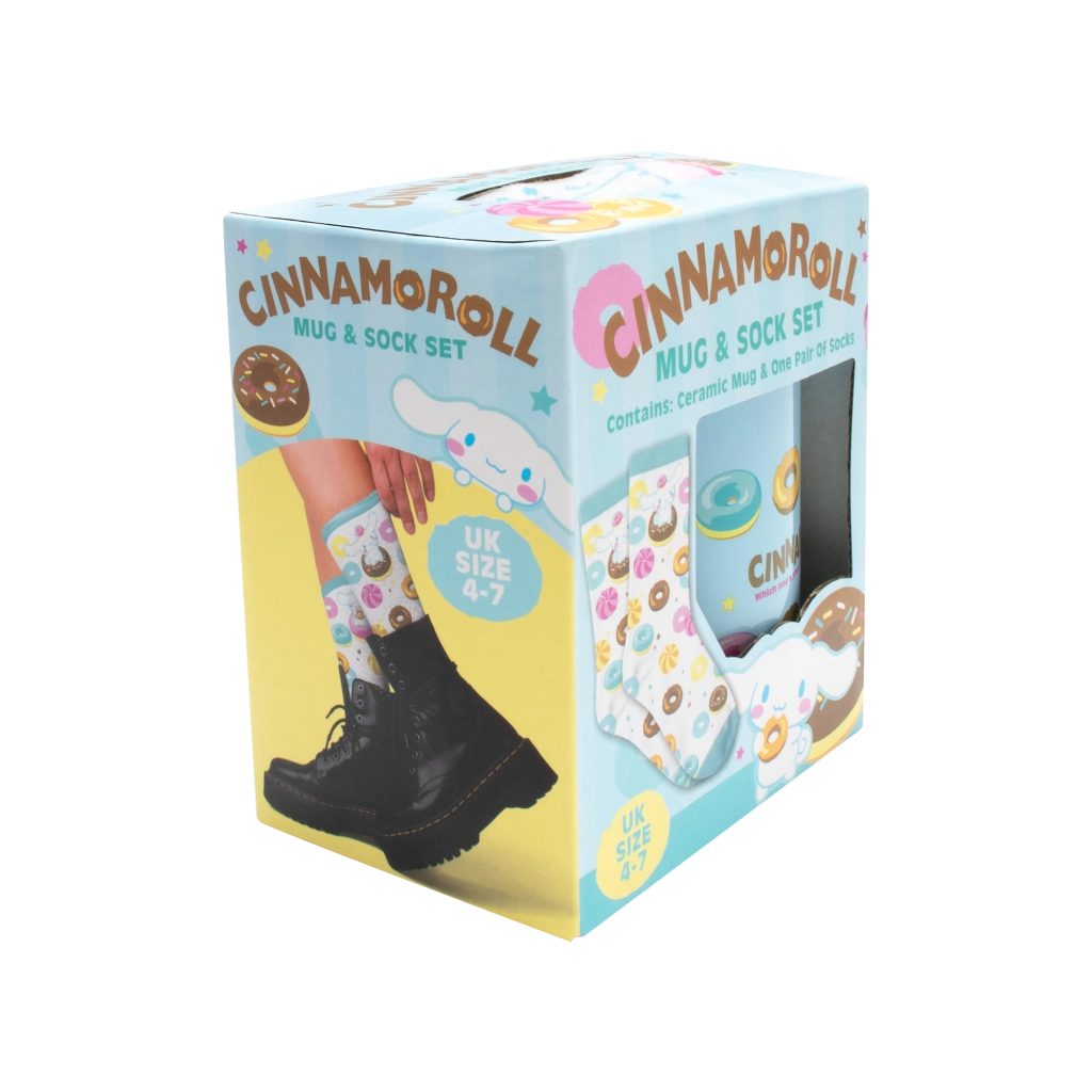 Aranyos ajándékszett Cinnamoroll-rajongóknak: világoskék, 330 ml-es kerámia bögre és kényelmes bokazokni 37–40. Stílusos dizájn fánkokkal és a Cinnamoroll figurával, ideális ajándék rajongóknak és gyűjtőknek. A bögre színes nyomattal, a zokni puha, rugalmas anyagból a kényelmes, egész napos viselethez.