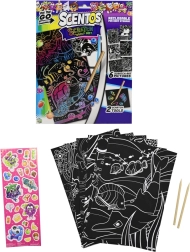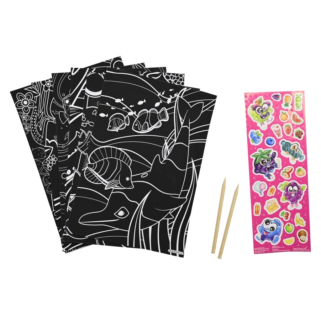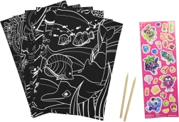 A fekete kártyák lekaparás után ragyogó színeket fednek fel. Tartozékok a fa stylusok és matricák a további díszítéshez.