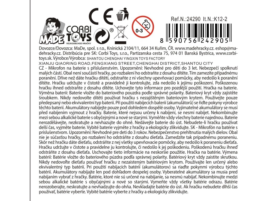 A gyerek elemes mikrofon órákon át tartó örömet és zenei élményeket nyújt. A könnyű kezelhetőségnek köszönhetően a legkisebb kezek is könnyen használják, a kis súlyú kivitel pedig ideális otthoni fellépésekhez és barátokkal való játékhoz. A színes kivitel felkelti a figyelmet és motiválja a gyerekeket a zene világának felfedezésére.