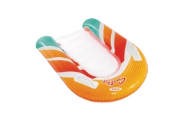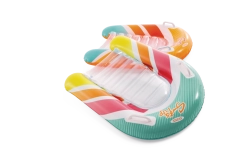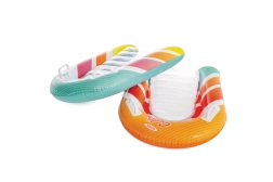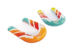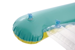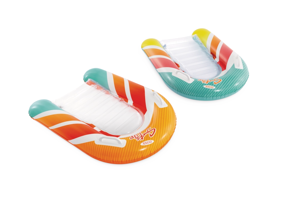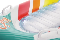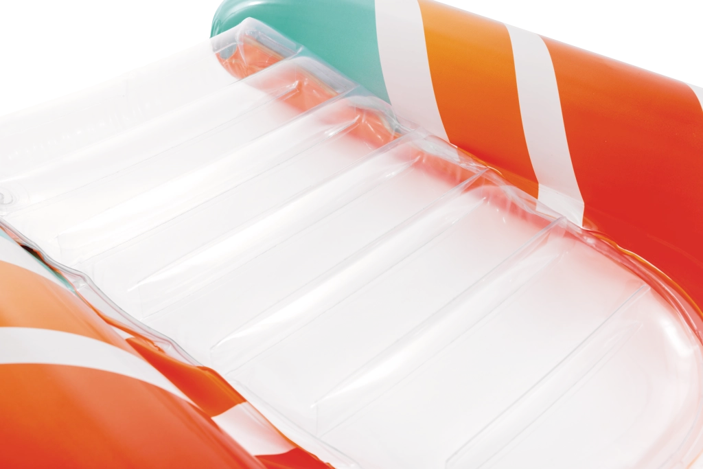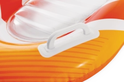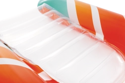 Az átlátszó, bordázott ülőrész kényelmet és jobb súlyelosztást biztosít a kellemes vízi pihenéshez. A biztonsági szelepek megakadályozzák a levegővesztést, és megkönnyítik a felfújást és leeresztést. A matrac két színváltozatban elérhető – feltűnő narancssárga vagy zöld csíkokkal –, hogy minden gyermek megtalálja a kedvenc stílusát.