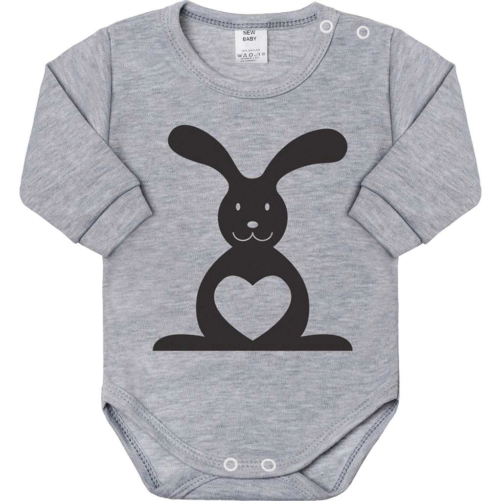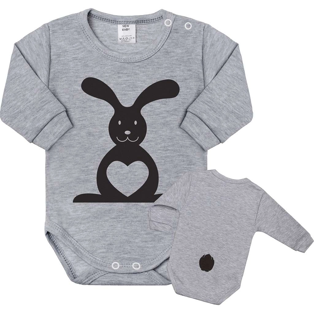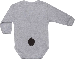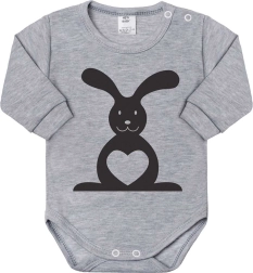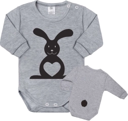 Ez a 100% pamut szürke body a baba mindennapi kényelmére készült. Az elejét egy nagy szívecskés nyuszi díszíti, hátul apró faroknyomat található. A puha jersey és a vállon, valamint a lábrésznél található patentos nyitás megkönnyíti az öltöztetést és a pelenkázást.