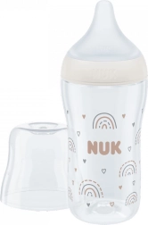 Az integrált NUK hőmérséklet-jelző színe kékről (hideg) fehérre (túl forró) változik, hogy segítsen elkerülni a túl meleg táplálék beadását. Az ideális hőmérséklet kb. 37 °C, amikor a jelző kék. Az üveg tartós, higiénikus üvegből készül, BPA-mentes, és megfelel az EN 14350 európai szabványnak.