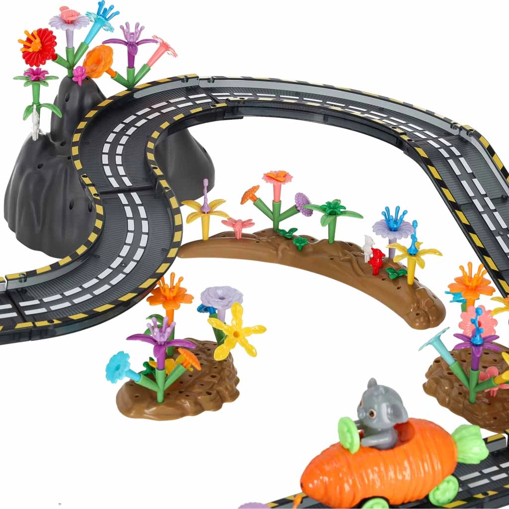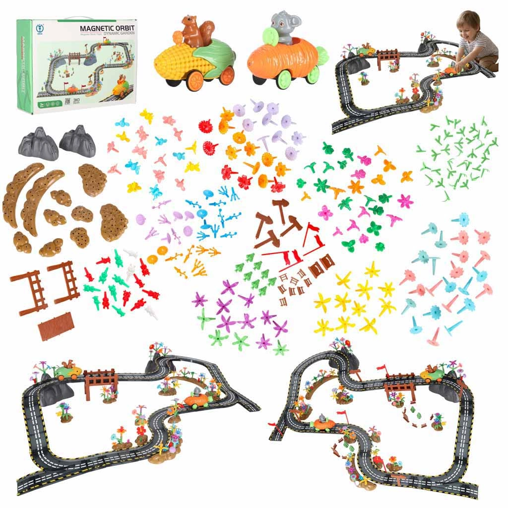 Fedezze fel az építés kreatív világát ezzel a mágneses versenypályával, 310 darabbal. A gyerekek könnyedén megépíthetik és átépíthetik a saját pályájukat, amelyet hidakkal, sziklákkal, kerítésekkel és virágokkal egészíthetnek ki. Két aranyos, világító kisautó (répa és kukorica) állatkás figurákkal dinamikusabb játékot hoz, miközben a mágneses csatlakozás stabilitást és gördülékeny építést biztosít. Ideális STEM játék a logika, a kreativitás és a fantázia fejlesztéséhez.