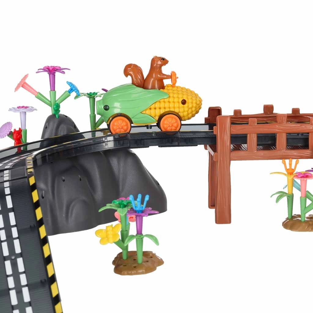 A csomagban 2 jármű található aranyos figurákkal (mókus és koala), híd, sorompó, sziklaakadályok és merevítő csatlakozók az erősebb pályához. Kiváló a STEM készségek fejlesztésére – tervezés, logikus gondolkodás és konstrukciós képességek.