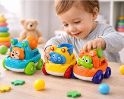 Három aranyos építőautó a legkisebbeknek, színes kivitelben, biztonságos, lekerekített formákkal és vidám állatfigurákkal. A gyerekek élvezik a toljad-és-megy járgást, a mozgó elemeket, és játékosan fedezik fel a gépek és állatok világát. Ideális 18 hónapos kortól a finommotorika, a koordináció és a képzelet fejlesztéséhez.