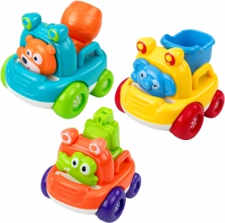 A készlet három különböző építőjárművet tartalmaz: markoló, keverő és billenőplatós teherautó – mindegyik kedves állatkával (krokodil, maci, kis elefánt). A masszív, lekerekített formák éles szélek nélkül biztosítják a biztonságos fogást a kis kezeknek, a sima kerekek pedig folyamatos gurításra csábítanak.