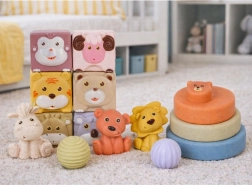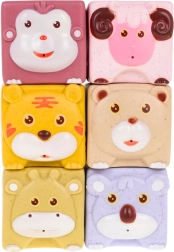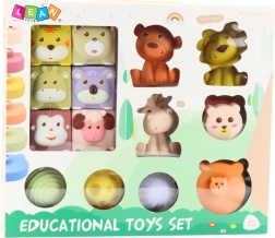 A szettben állatos mintájú négyzet alakú kockák, toronyépítő kerek elemek, nyomkodható figurák és szenzoros labdák találhatók. A játékok szárazon és fürdőjátékra is alkalmasak, gyorsan száradnak és könnyen tisztíthatók – ideálisak mindennapi használatra otthon és útközben is.