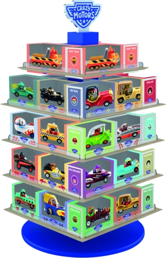 A Crazy Motors forgatható állvány hatékony rendszerezésre és látványos prezentációra készült. A forgó mechanizmusnak köszönhetően minden kisautó szem előtt és kéznél van, anélkül, hogy állandóan át kellene rendezni őket.