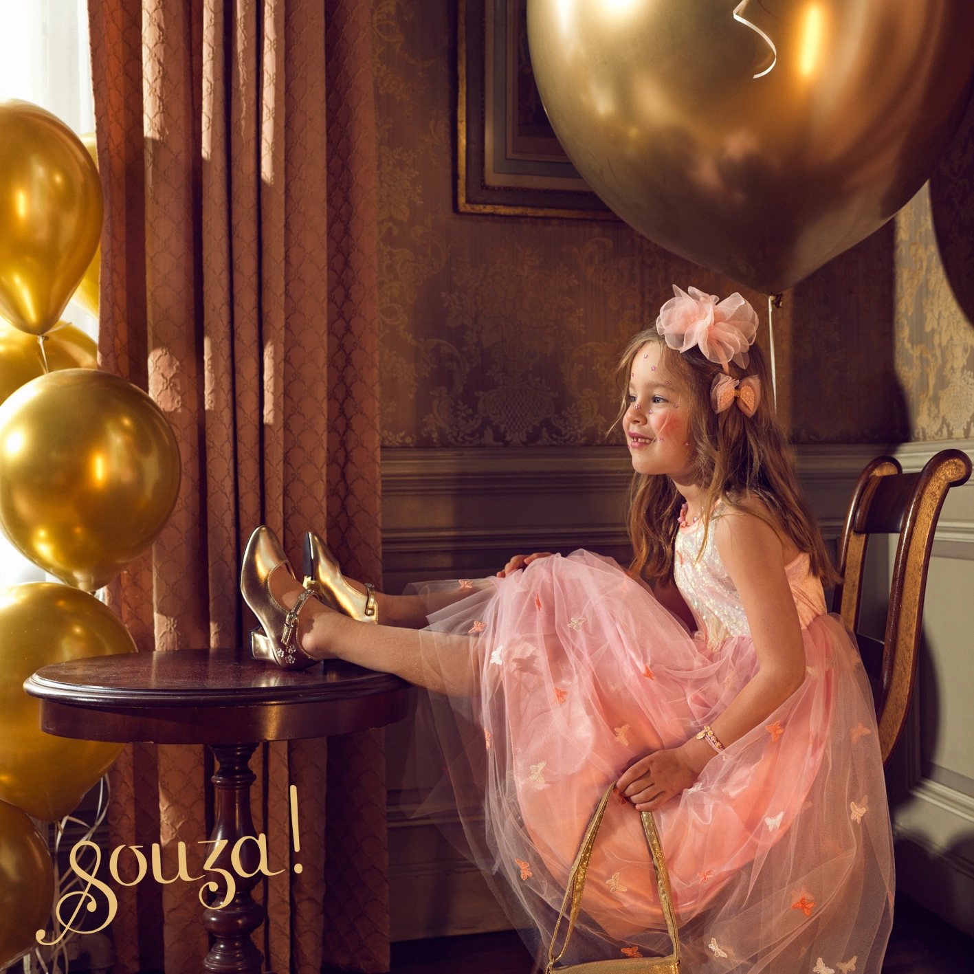 A Souza Elise hercegnőruhája minden alkalommal mosolyt csal az arcokra. A könnyű és kellemes anyag egész napos kényelmet biztosít, míg a finom pillangókkal díszített tüllszoknya varázslatos részletet ad a ruhának.