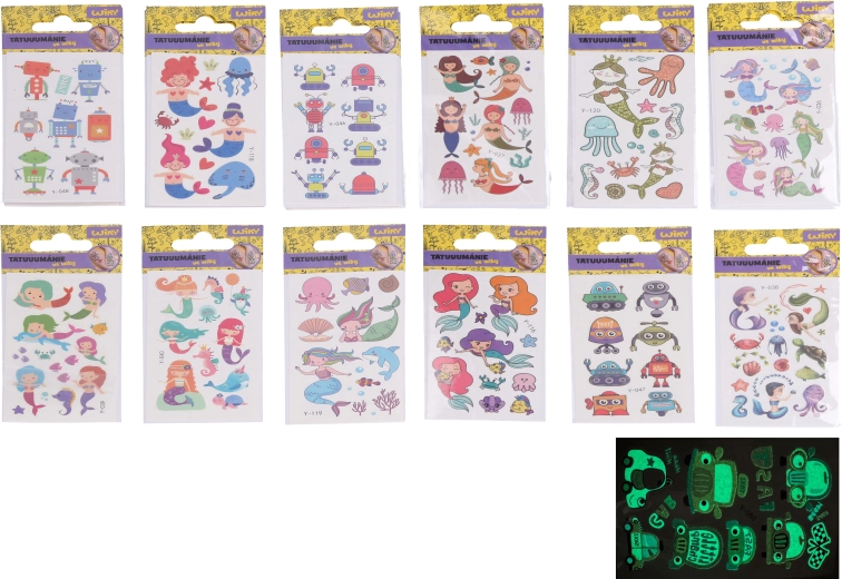 Ideiglenes tetoválás, amely igazán ragyog! Ezek a tetoválásmatricák változatos motívumokat kínálnak, és megvilágítás után világítanak a sötétben, így tökéletesek ünnepségekre, fesztiválokra és jelmezekhez. Bőrbarátok, és vízzel könnyen felhelyezhetők.