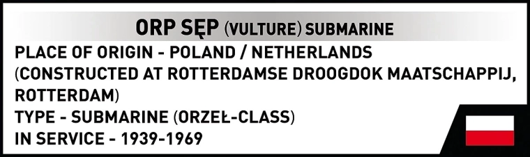 A COBI Historical Collection sorozat ORP Sęp modellje a lengyel Orzeł osztályú tengeralattjáró részletgazdag, gyűjtői változata. Kompakt méreteinek és gondosan megválasztott színeinek köszönhetően polcon és vitrinben is remekül mutat. A készlet a Gdyniai Haditengerészeti Múzeummal együttműködésben készült, és ötvözi a lebilincselő történelmet a precíz kivitelezéssel.