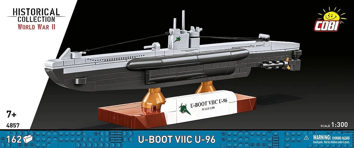 A csomag tartalmaz egy masszív talapzatot U-BOOT VIIC U-96 felirattal, amely kiemeli a modelledet és biztos tartást ad a bemutatás során.