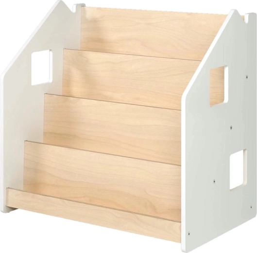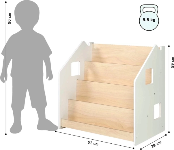 A praktikus BusyKids gyerekkönyv‑állvány támogatja az önállóságot és az olvasás szeretetét. Az előre néző borítók révén a gyerekek könnyen kiválaszthatják a kedvencüket. 4 tágas polcot és hátsó tárolóteret kínál könyveknek vagy játékoknak. A konstrukció masszív és biztonságos, lekerekített élekkel és vízbázisú lakkozással. Minimalista kialakítása bármely enteriőrbe illik.