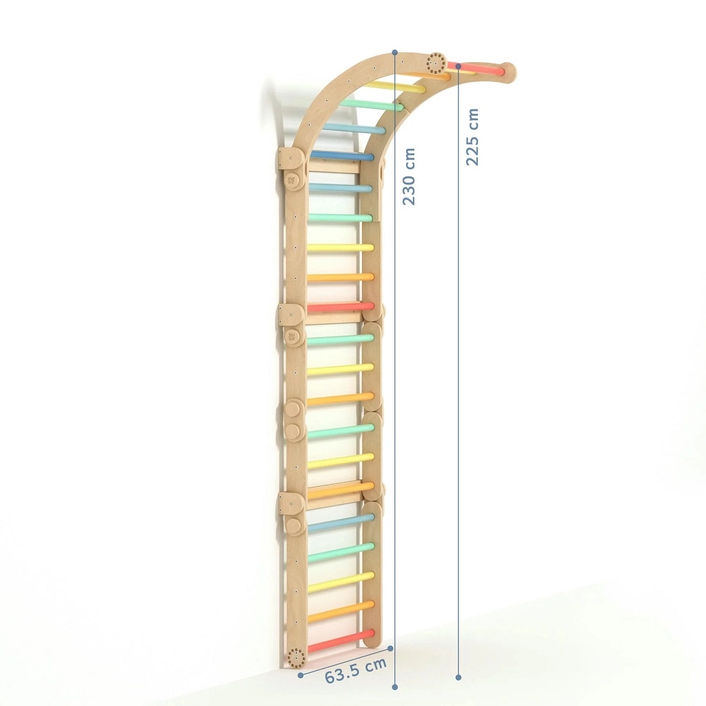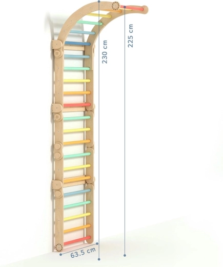 A BUSYKIDS házi bordásfal húzódzkodórúddal, szivárványos kivitelben okos dizájnt, minőségi anyagokat és széles játéklehetőségeket egyesít. A két háromszögből és egyensúlyozó ívből álló szett használható a padlón kúszáshoz és az első mászásokhoz, vagy speciális fali rögzítéssel valódi mászófallá alakítható. A színes fokok játékra csábítanak, és fejlesztik a koordinációt, az erőt és az egyensúlyt.