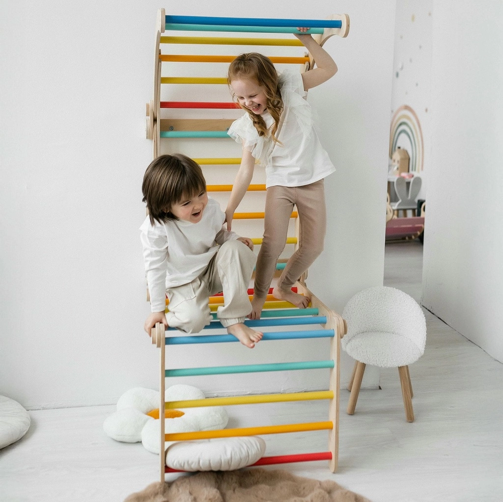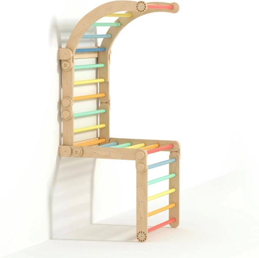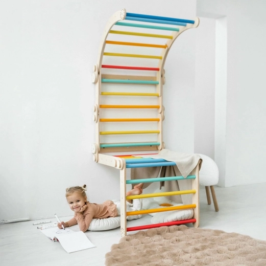 A rúd és a szivárványos fokok motiválnak a lógásra és mászásra, miközben a sima élek és a stabil keret minden tevékenységnél biztonságot nyújtanak.