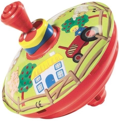 Ez a hagyományos, paraszti udvar motívummal díszített pörgettyű ideális játék a legkisebbek számára. Az egyszerű, lenyomható kar mechanizmusa megforgatja a pörgettyűt, amely forgás közben jellegzetes hangot ad és vizuális ingereket biztosít.