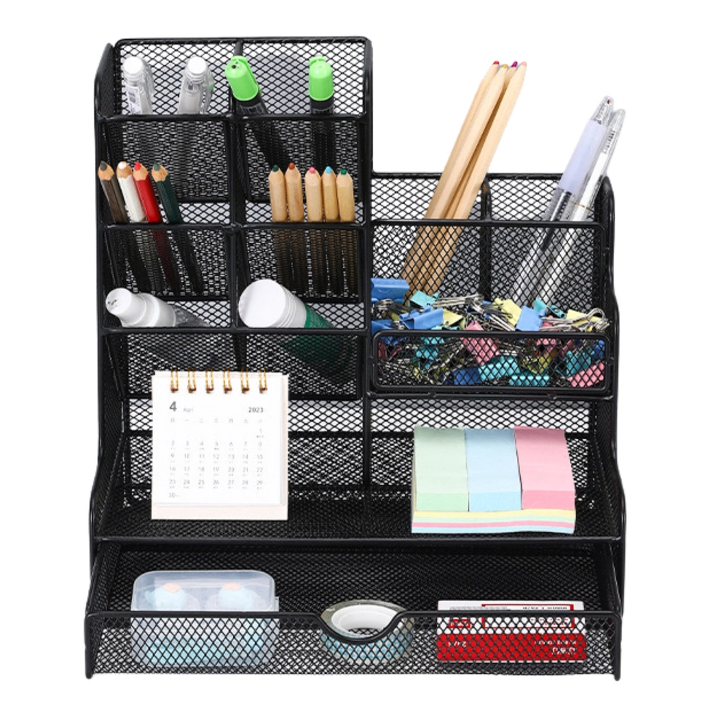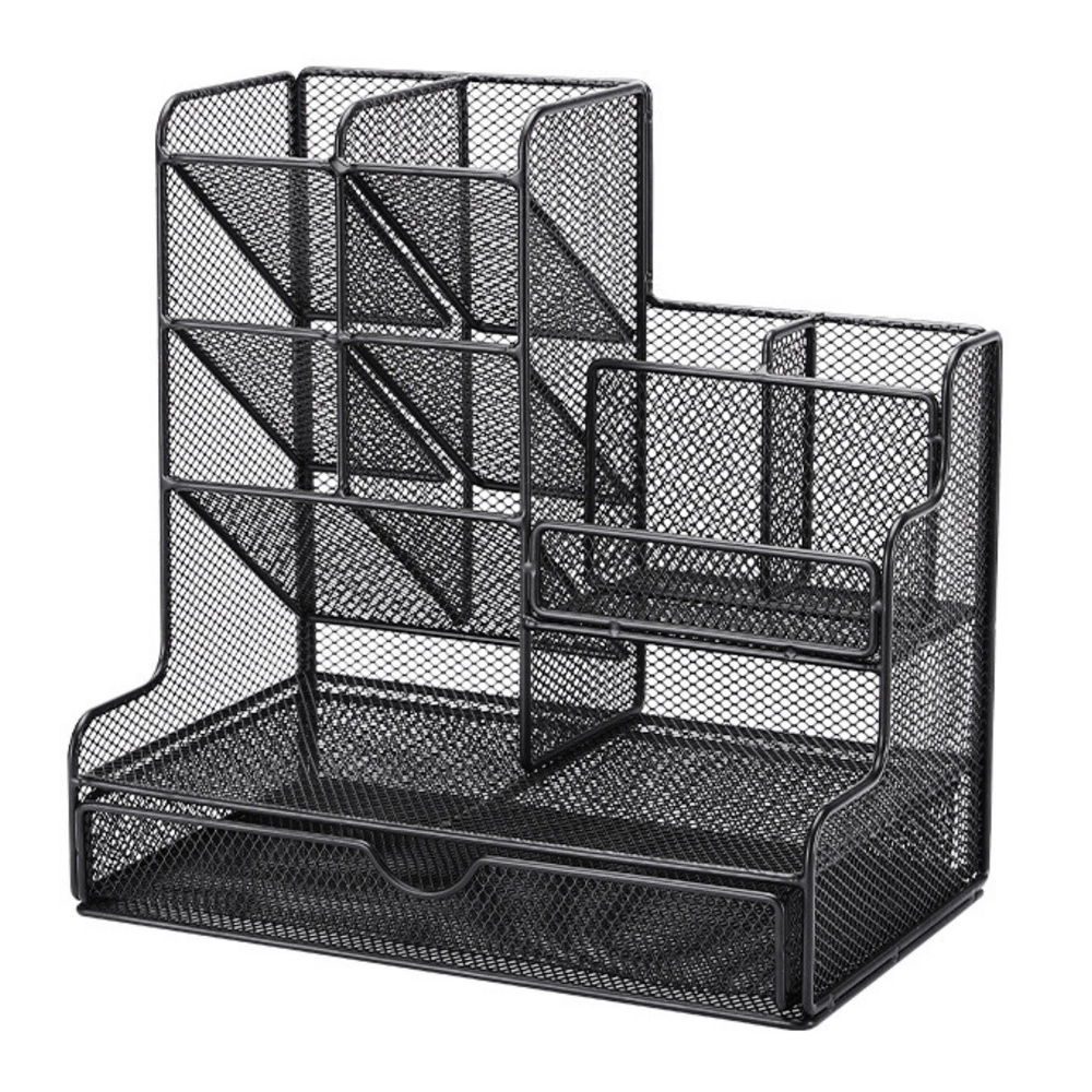 Tarts rendet az íróasztalon a lakkozott fémhálóból készült rendszerezővel, amely ötvözi a modern dizájnt és a magas tartósságot. A fekete kivitel illik bármely belső térhez, és professzionális megjelenést kölcsönöz a munkakörnyezetednek.