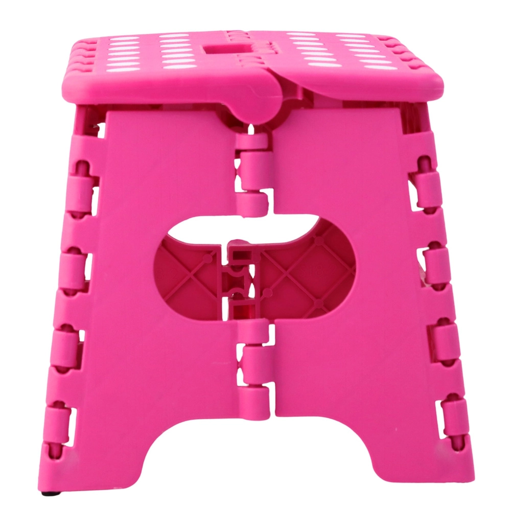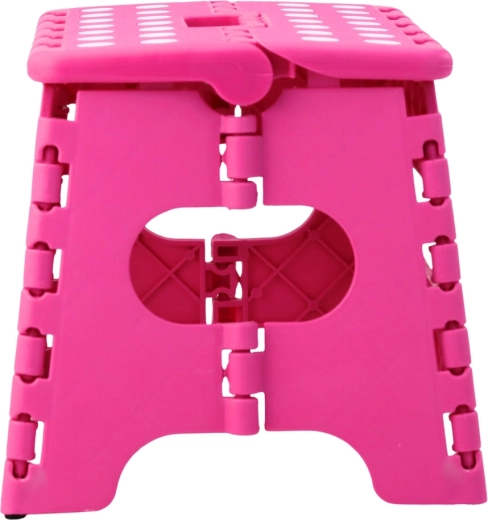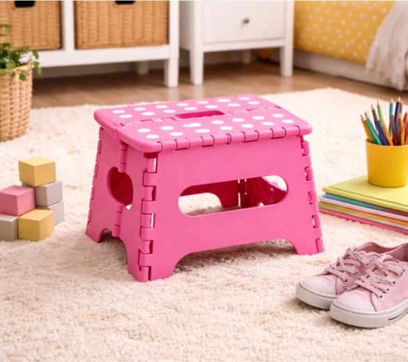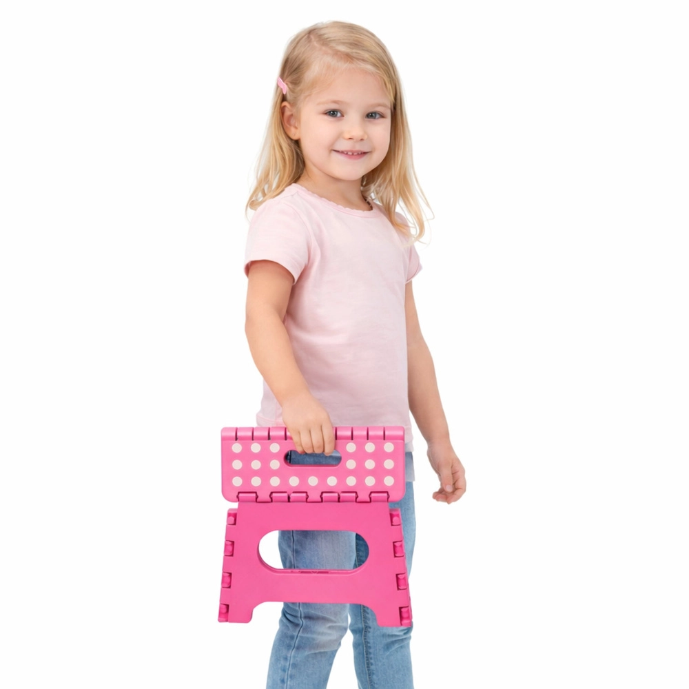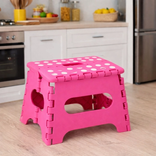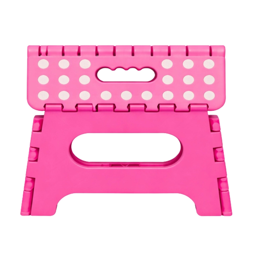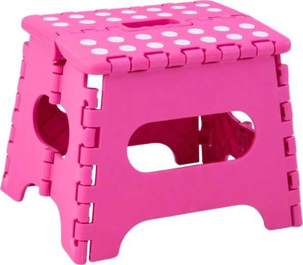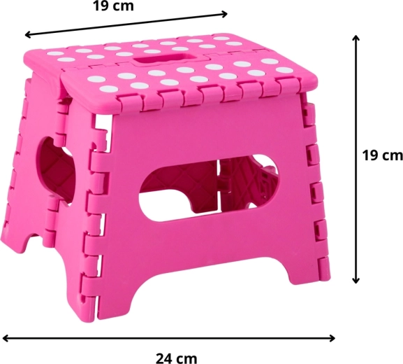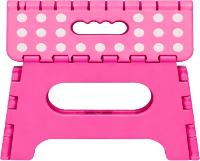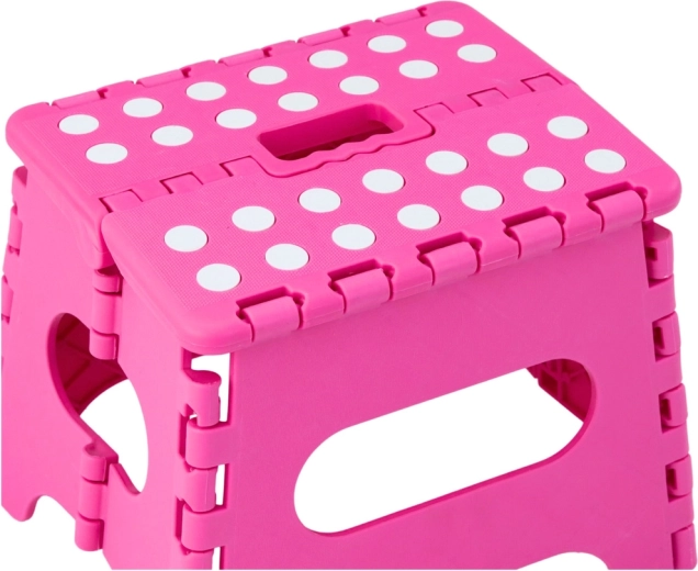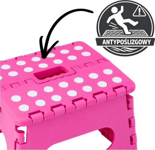 A rózsaszín összecsukható fellépő tartós műanyagból készült, amely szilárdságot és hosszú élettartamot biztosít. A pöttyös, csúszásgátló felső felület növeli a biztonságot használat közben, még nedves környezetben is. Az integrált fogantyú lehetővé teszi a gyors hordozást, valamint a könnyű, laposra hajtható tárolást.
