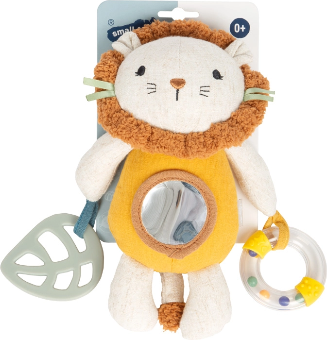 A selymes tapintású oroszlánka muszlinból és plüssből készült felülete kellemes érzetet nyújt és ölelgetésre csábít. A gyöngyös, beépített csörgő, a kis, biztonságos tükör a pocakon és a puha rágóka sokféle ingert biztosít a babáknak látás, hallás és tapintás terén. Az akasztóklipsz segítségével az oroszlánkát könnyedén a babakocsira, kiságyra, autósülésre vagy tornapálcára rögzítheti.