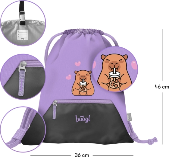 Stílusos és funkcionális Baagl tornazsák kapibara mintával, alkalmas váltócipőre, sportfelszerelésre és szakköri holmikra. A strapabíró, könnyen tisztítható anyag hosszú élettartamot biztosít, míg a praktikus elülső cipzáras zseb kéznél tartja a kulcsokat, pénztárcát vagy apróságokat.