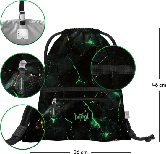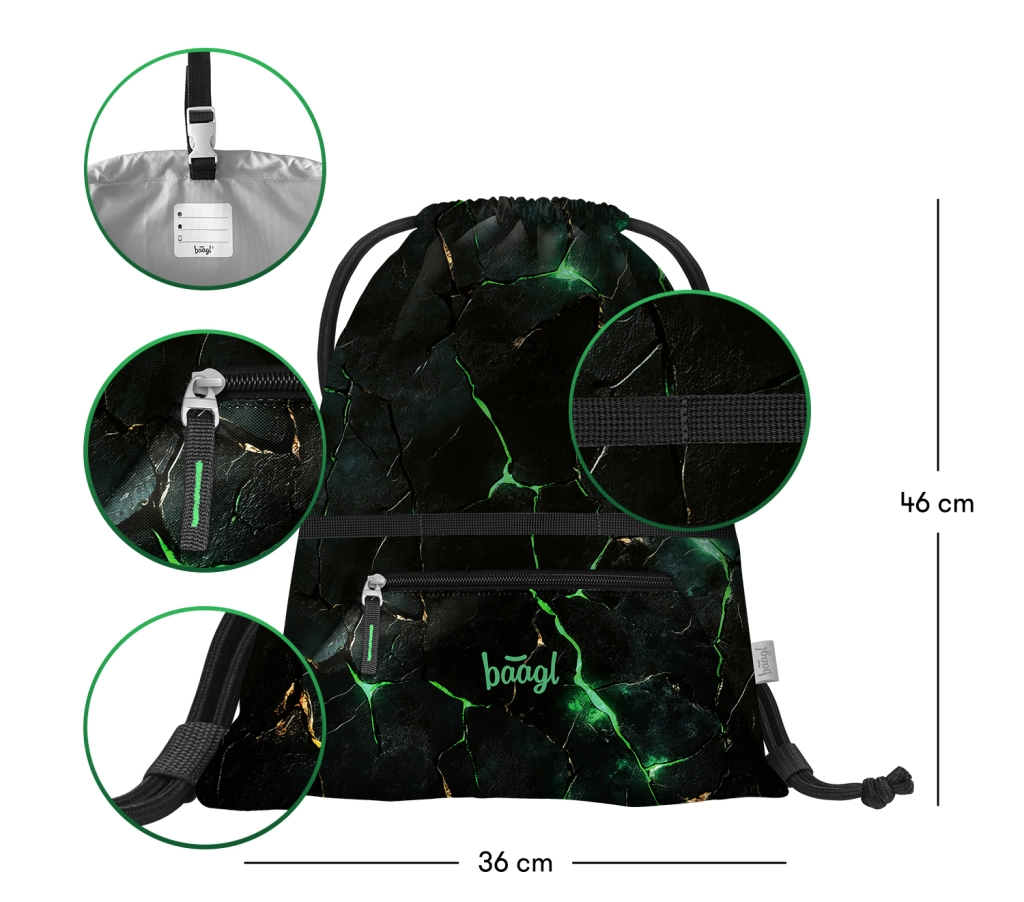 A BAAGL márkájú, cipzáras zsebbe̋l ellátott, praktikus iskolai tornazsák ideális váltócipőhöz, lábbelikhez és sportfelszereléshez. Erős, mosható anyagból készült, strapabíró zsinórokkal a kényelmes hordáshoz, valamint kampóval ellátott füllel a könnyű rögzítéshez hátizsákhoz vagy aktatáskàhoz.