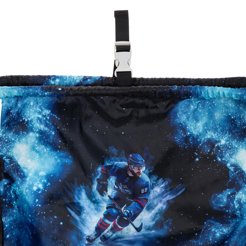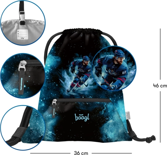 Praktikus iskolai és szabadidős BAAGL zsák JÉGKORONG mintával, ideális váltócipőhöz, sporthoz és utazáshoz. Tágas fő rekeszt, apróságoknak való cipzáras elülső zsebet és erős zsinórokat kínál a kényelmes hordáshoz. Tartós, mosható anyagból készült, és a csatos fülnek köszönhetően könnyen a hátizsákra vagy aktatáskához rögzíthető.