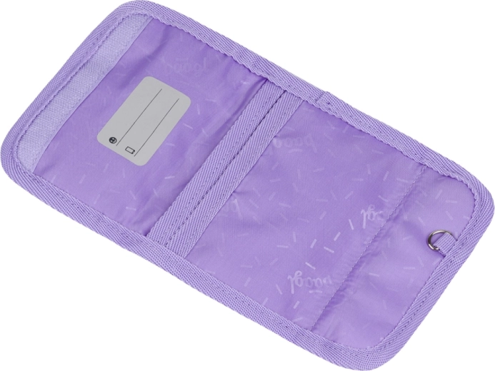 A praktikus tagolás tépőzáras zárást, külön cipzáras aprótartó zsebet és belső rendezőt kínál az apróságok, ebédkártya vagy kulcsok számára. Belül névjegycímke segíti az azonosítást, valamint karika a kulcs vagy karabiner rögzítéséhez.