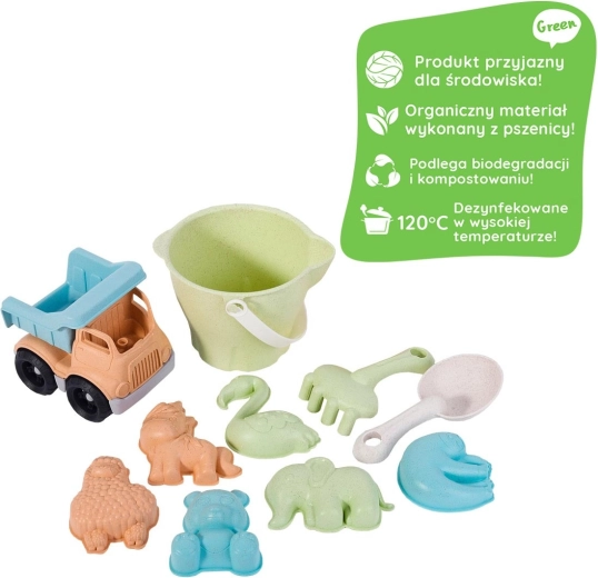Fedezd fel a játékos és egyben környezettudatos szórakozást a WOOPIE GREEN gyerek homokozókészlettel. Ez a 11 darabból álló, modern pasztellszínekben készült szett vödröt, locsolókannát, billenőplatós teherautót, lapátokat és állatfigurás formákat tartalmaz építéshez és alkotáshoz. Organikus, biológiailag lebomló, búzaszalmán alapuló anyagból készült és komposztálható. A lekerekített éleknek, a kényelmes fogóknak és a 120 °C-on történő fertőtlenítésnek köszönhetően a készlet gyerekek számára biztonságos, ideális homokozóba, strandra és a kertbe is.