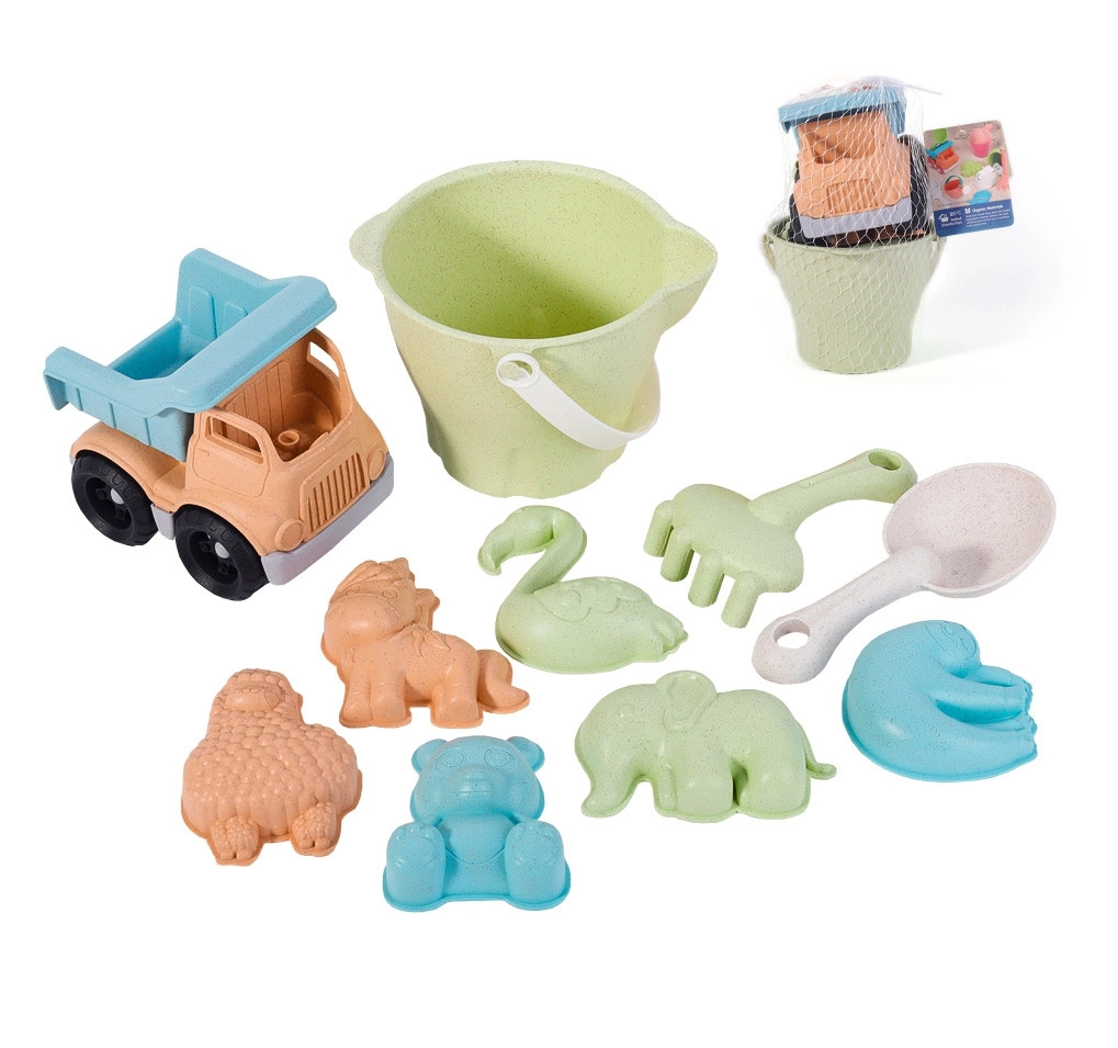- Komplett felszerelés: füllel ellátott vödör, locsolókanna, billenőplatós teherautó, 2 lapát, 4 forma.