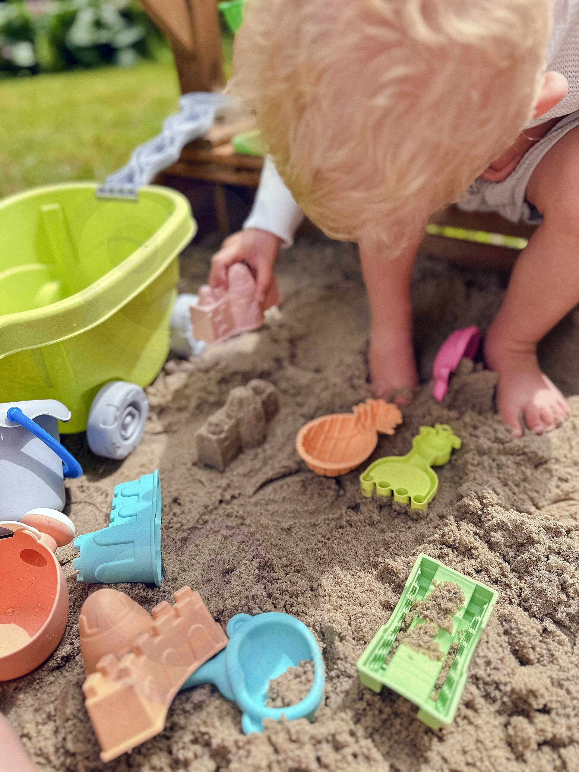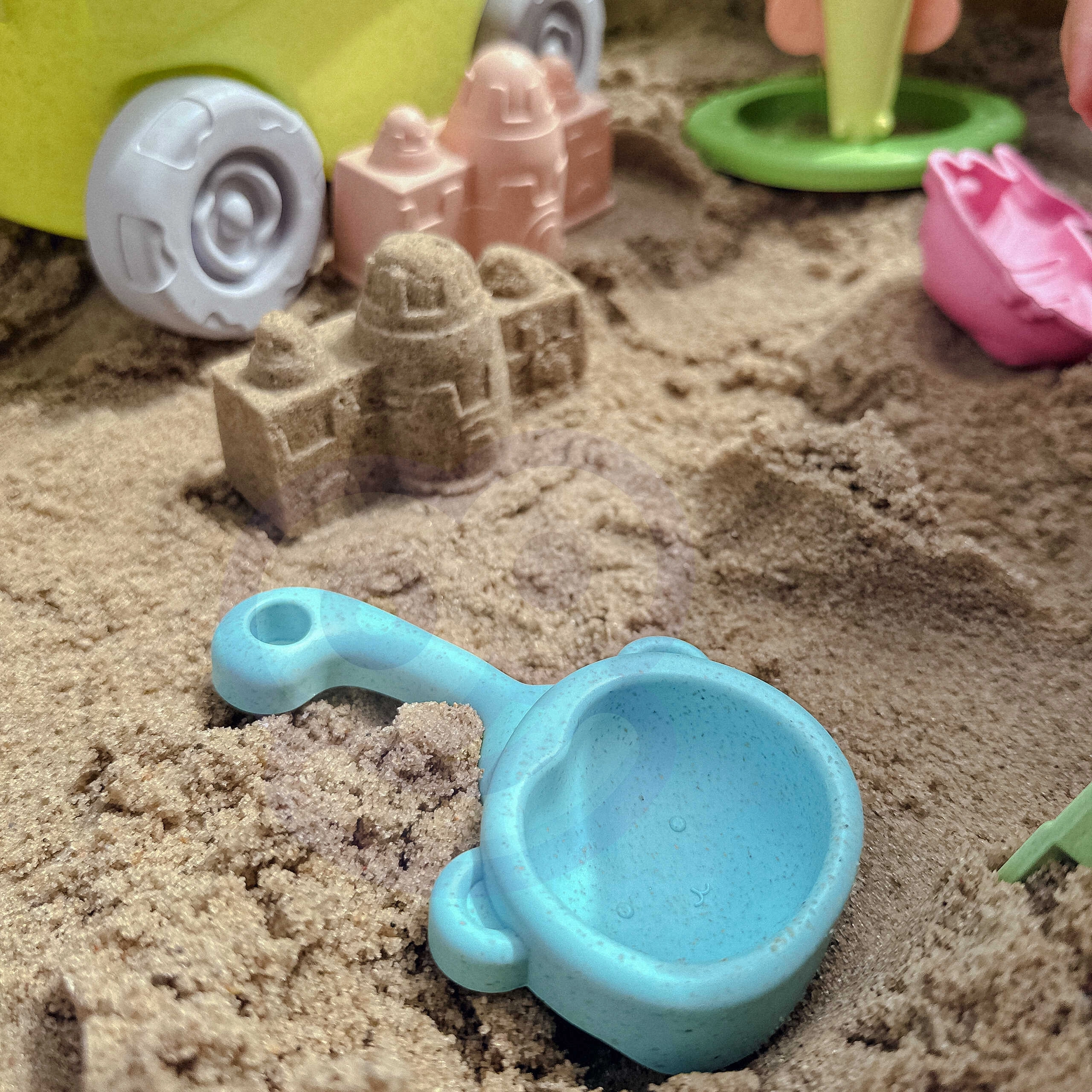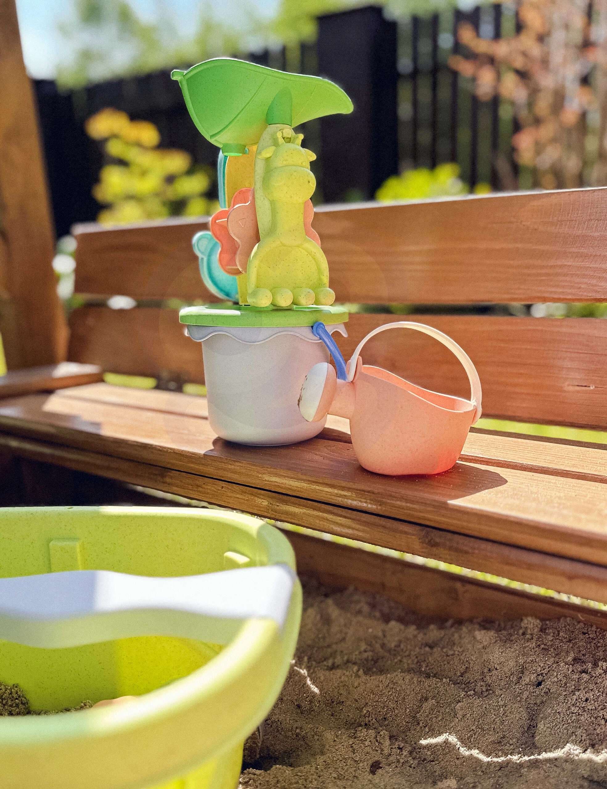 A szett organikus, biológiailag lebomló anyagból készült, és komposztálható, így kíméli a természetet. A sima, lekerekített élek és a könnyű kialakítás támogatják a biztonságos játékot, valamint a gyerekek fantáziájának és finommotorikájának fejlesztését.