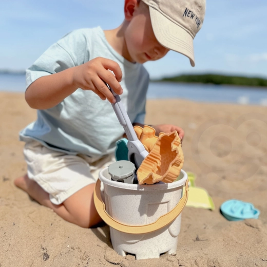 A WOOPIE GREEN gyerek homokozó készlet modern pasztell színekben, organikus, biológiailag lebomló anyagból készült 10 részes csomagot kínál. Tartalma: vödör kényelmes füllel, 6 forma, lapát, gereblye és egy guruló kisautó – ideális a homokozóba, a strandra és a kertbe is. Az anyag környezetbarát és komposztálható.