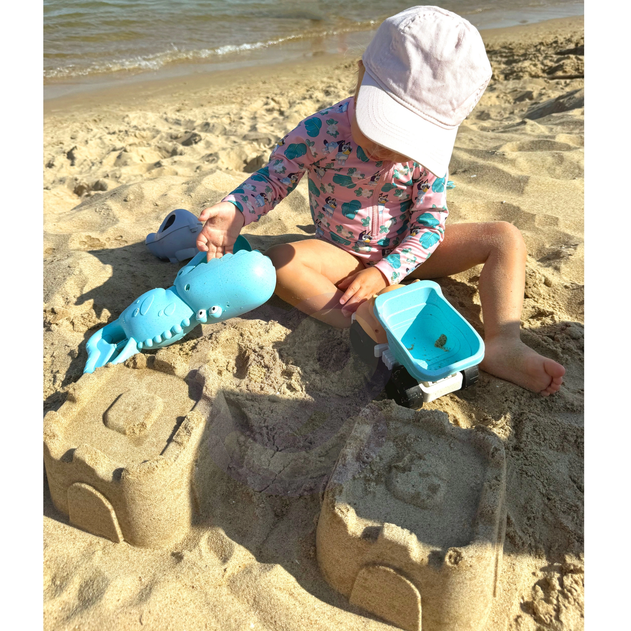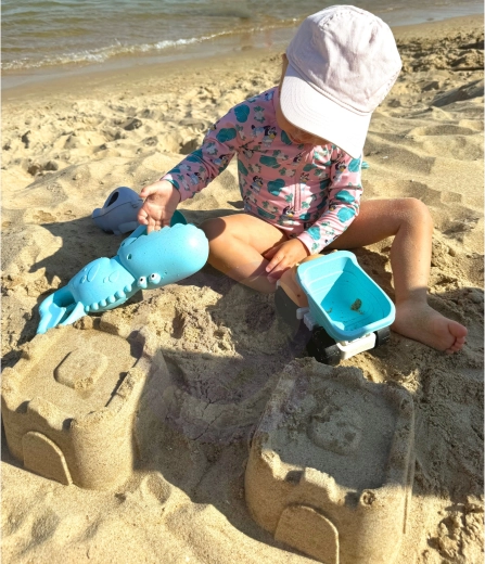 A készlet támogatja a gyerekek finommotorikájának, szem–kéz koordinációjának, képzeletének és térbeli gondolkodásának fejlődését. A kisautóval, krokodilos fogóval és formákkal a gyerekek várat építenek, átszitálják a homokot és rakományt szállítanak. Minden elem könnyű, kedvelt állatfigurákkal és lekerekített, barátságos formákkal a biztonságos játékért.