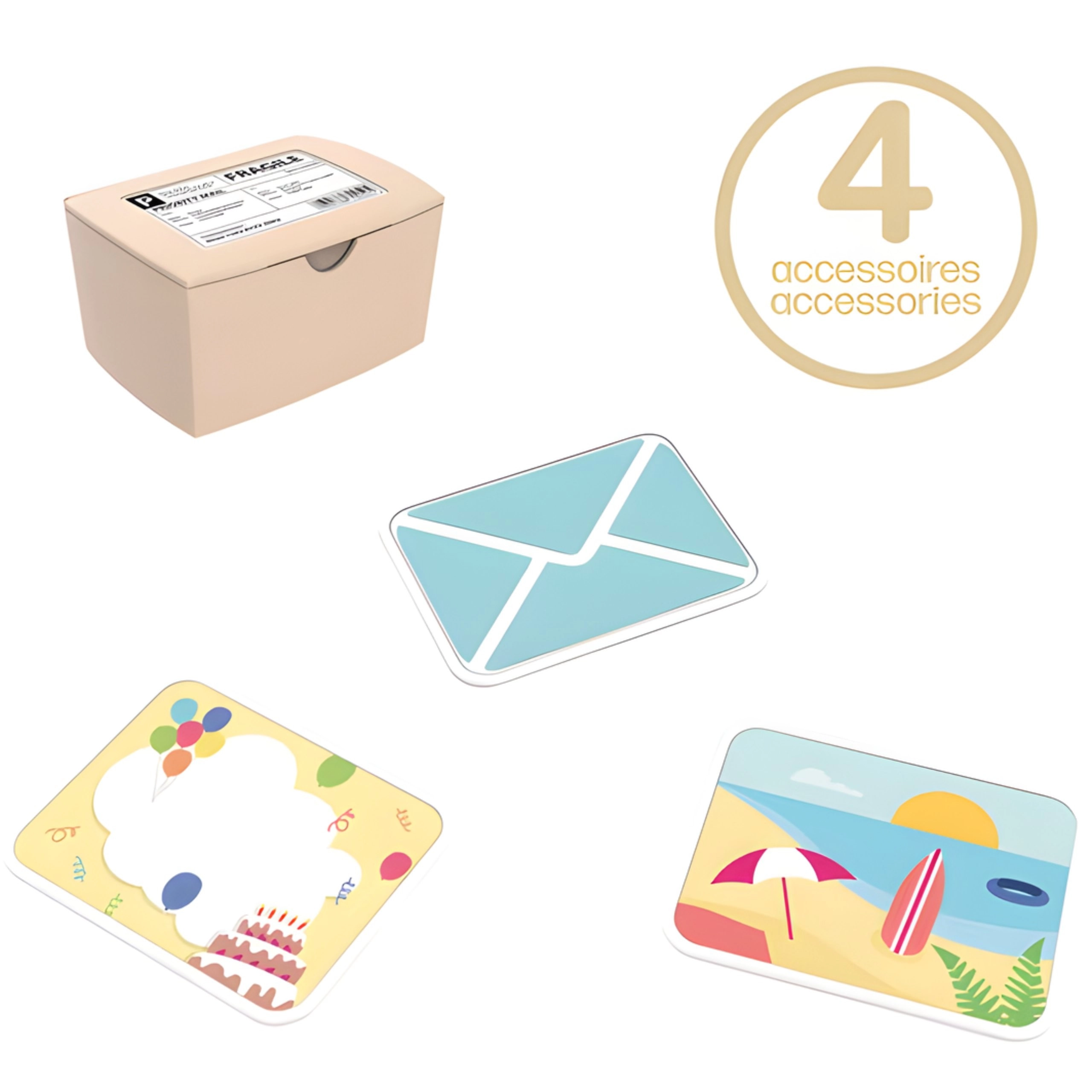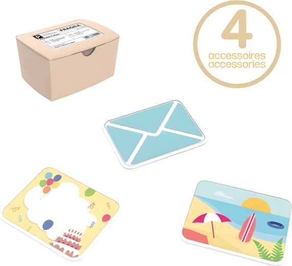 - Kreatív postajáték: levelek, kártyácskák és csomag a valósághű jelenetekhez.