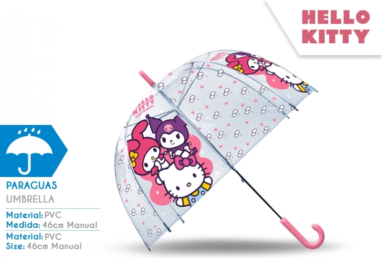 Aranyos, áttetsző esernyő Hello Kitty mintával, amely megbízható védelmet nyújt eső és nap ellen. Könnyű, könnyen kezelhető, és az egyszerű kézi nyitásnak köszönhetően ideális gyermekeknek.