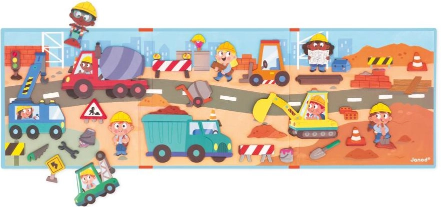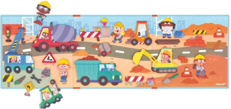 A Janod mágneses könyv építkezés témában tökéletes választás szórakozáshoz és tanuláshoz. A gyerekek különböző jeleneteket rakhatnak ki, történeteket alkothatnak, miközben fejlődik finommotorikájuk és logikus gondolkodásuk. A masszív háttérnek és minőségi mágneseknek köszönhetően az elemek a helyükön maradnak, akár otthon, akár utazás közben.